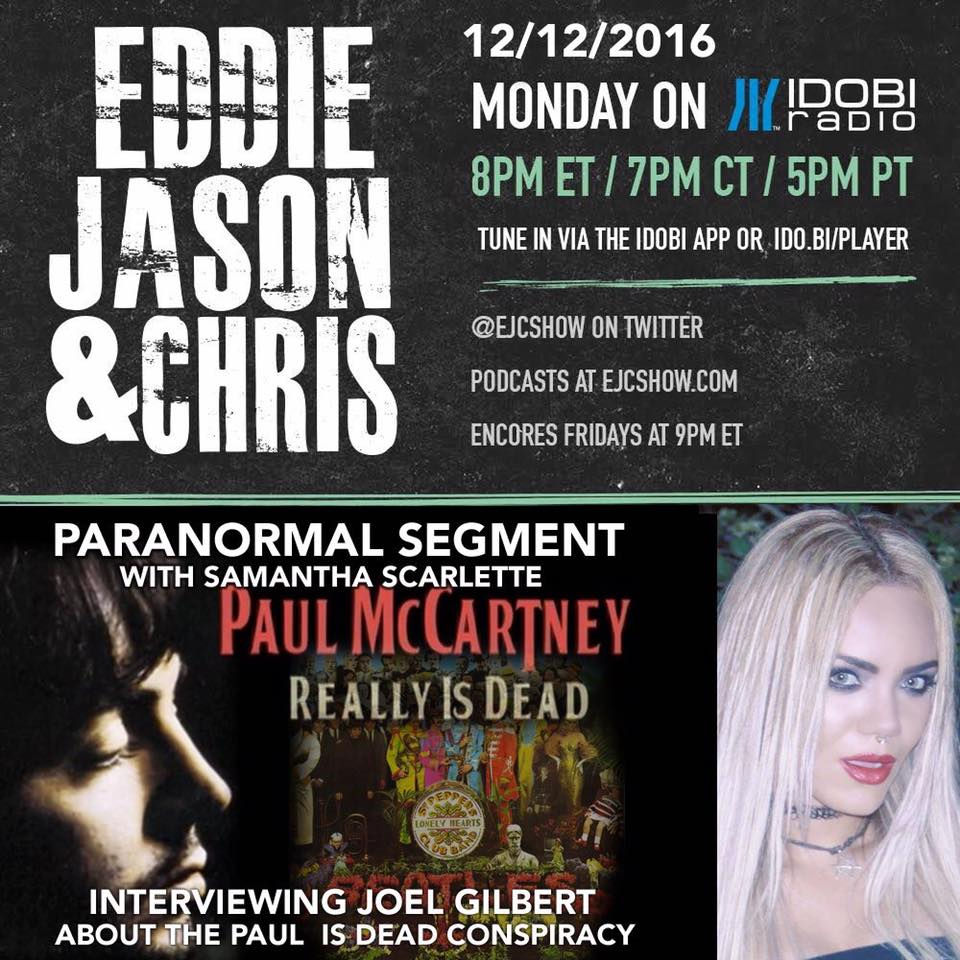 This Monday December 12th on Samantha Scarlette’s segment for the Eddie, Jason & Chris Show, Samantha Scarlette brings on Joel Gilbert on the Paul Is Dead conspiracy .